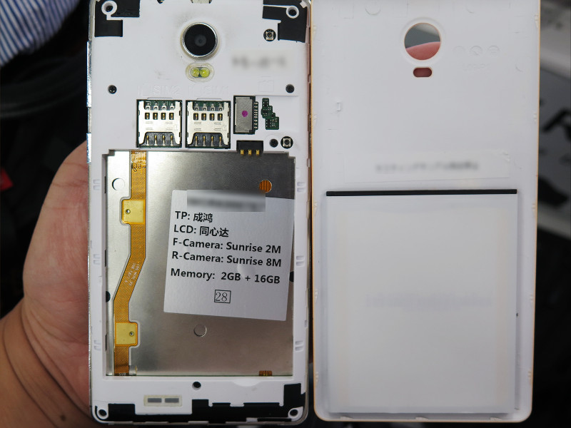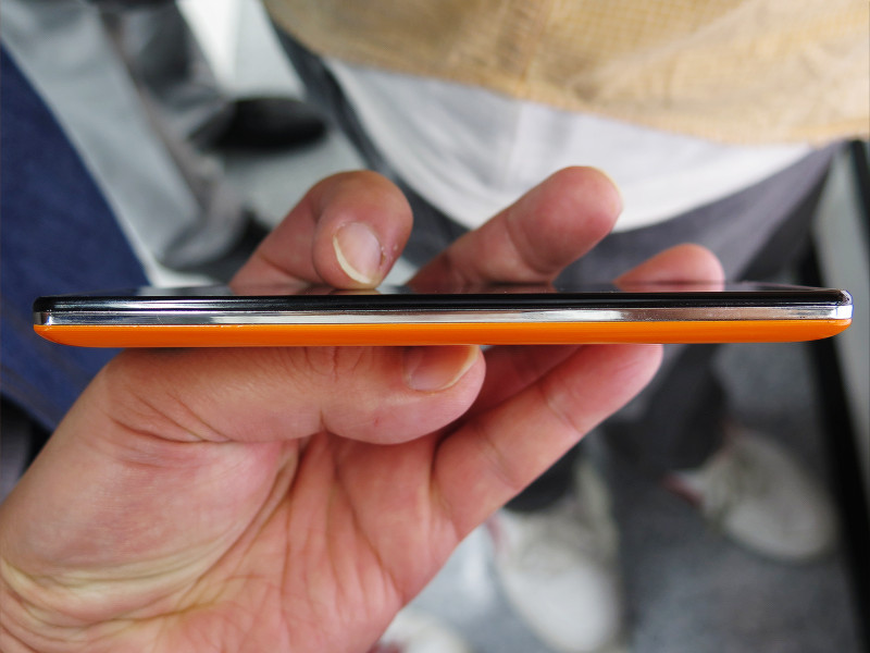 カバーを外すと、microSIMカードサイズ(3FF)のスロットが2基とmicroSDカードスロット(対応容量は現在未公表)がありました。説明員によるとSIMカードスロット2は2G(GSM方式)専用のスロットとなっているそうです。
