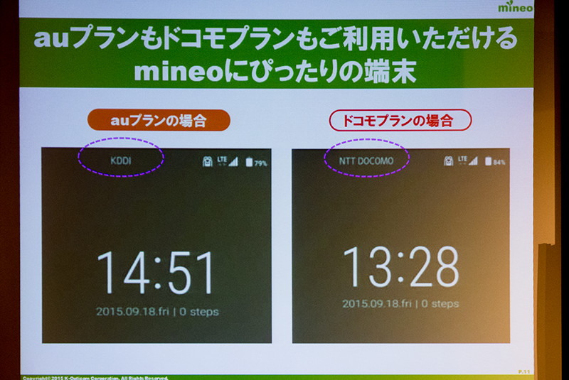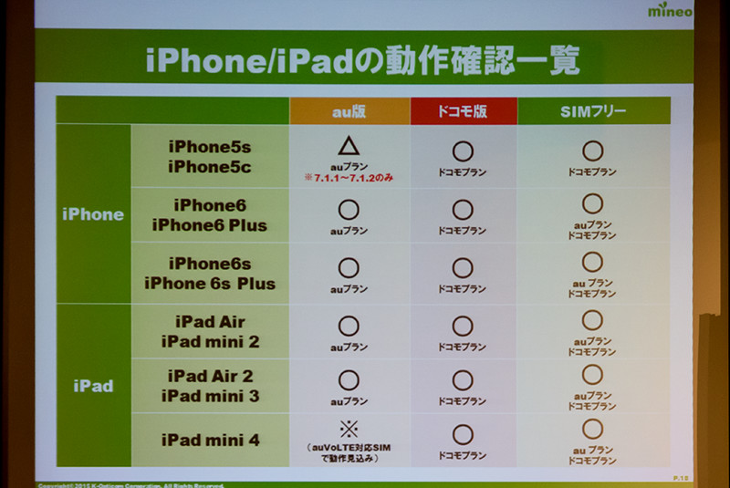 その他にも今回、iPhoneおよびiPadの動作確認についても発表があった。というのも、従来は昨年のiOS 8の提供以降にauプランで使えなくなっていたが、テスト版のAPN構成プロファイルを提供して動作検証を続けてきたが、iOS 9の提供開始に合わせてiOS 8以降の場合にauプランにおけるiPhone 5s、5c、iPad mini 4以外はそれぞれのプランで利用可能であるのだという。auプランのiPad mini 4はau VoLTE対応SIMで利用可能になる見込みだという。なお、VoLTEについてはソフトウェア対応であるため、対応機種であれば通常のSIMで利用可能とのことだった。
