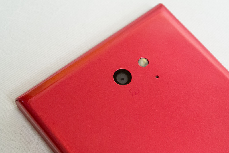 背面カメラは約810万画素CMOSセンサー、前面カメラは約240万画素CMSOセンサーを搭載する。カメラの下にはFeliCaのマークがあり、対応FeliCaサービスについては今後発表していくとのことだった。