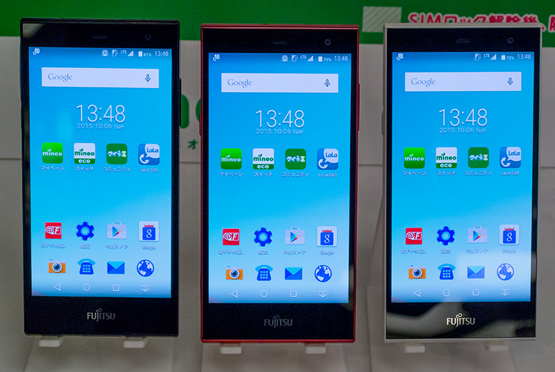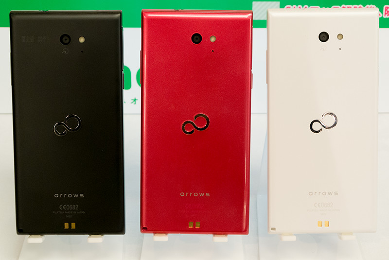 続いて、発表会のプレゼンテーションの後に行われたタッチ&トライの模様を紹介する。まず、arrows M02は約5.0インチHD(720×1280ドット)有機ELディスプレイを搭載するミドルレンジスマホだ。ベースはNTTドコモ向けに発売された「arrows Fit F-01H」となり、指紋センサーが省かれたほか、若干仕様が異なる。