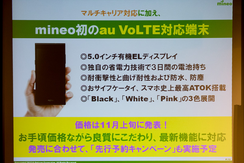 既報通り、ケイ・オプティコムは6日、都内にて「mineo 新端末・サービス発表会」を開催し、同社がNTTドコモやauから回線を借り入れて仮想移動体通信事業者(MVNO)として提供している携帯電話サービス「mineo(マイネオ)」( https://mineo.jp
