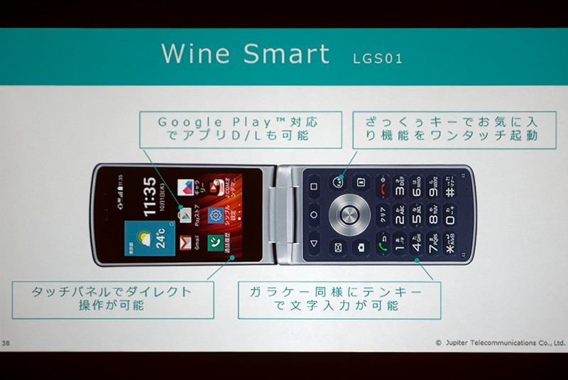 J:COM MOBILEのスマホ第1弾としてLG Wine Smart LGS01を発売する。はじめての方でも使いやすいよう、ケータイのような折りたたみ型でダイアルキーによるボタン操作とタッチ操作両方が使えるものとしている。SIMロックがかかっており、日本国内ではJ:COMの独占販売となる。