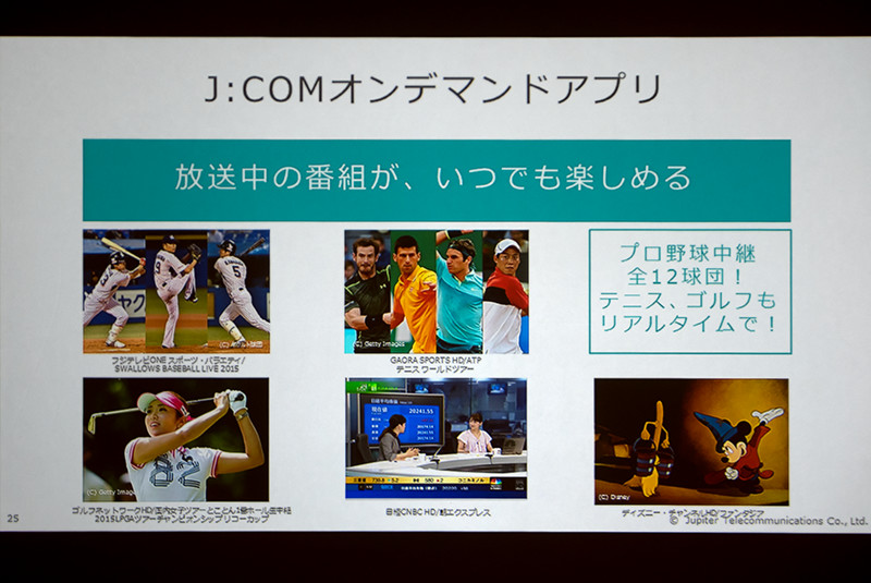 J:COMオンデマンドには約3.8万本のコンテンツがあるほか、放送中の番組も楽しめるのだという。たくさん映像配信サービスが出てきているが接触機会がないため、利用できていない人が多い。どこでも見れるスマホやタブレットを提供することで空き時間にちょっとスポーツ観戦をしたりといったこともできるようになるということだ。