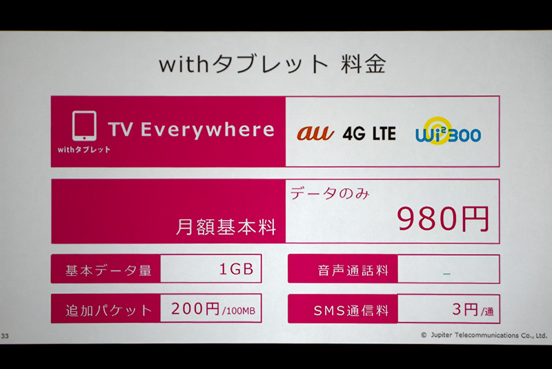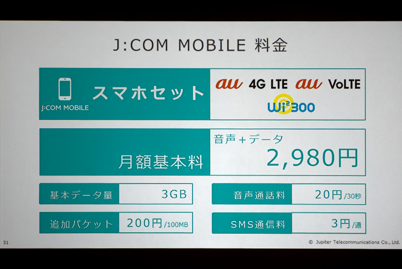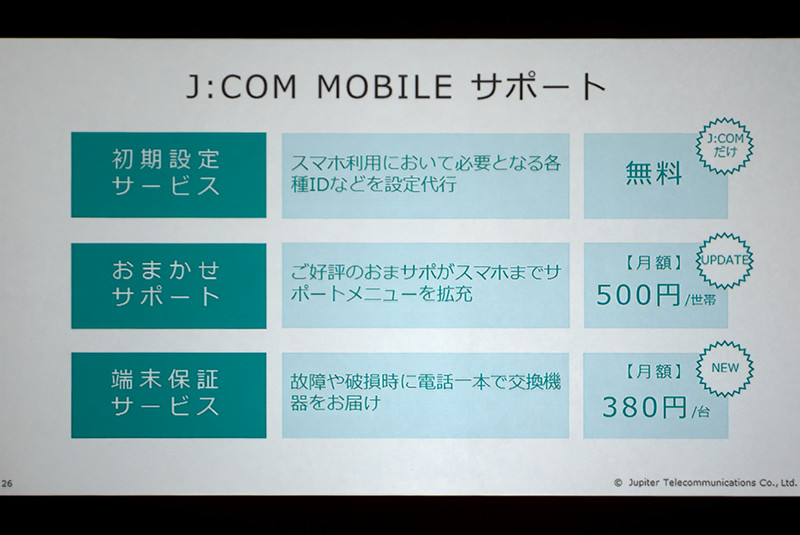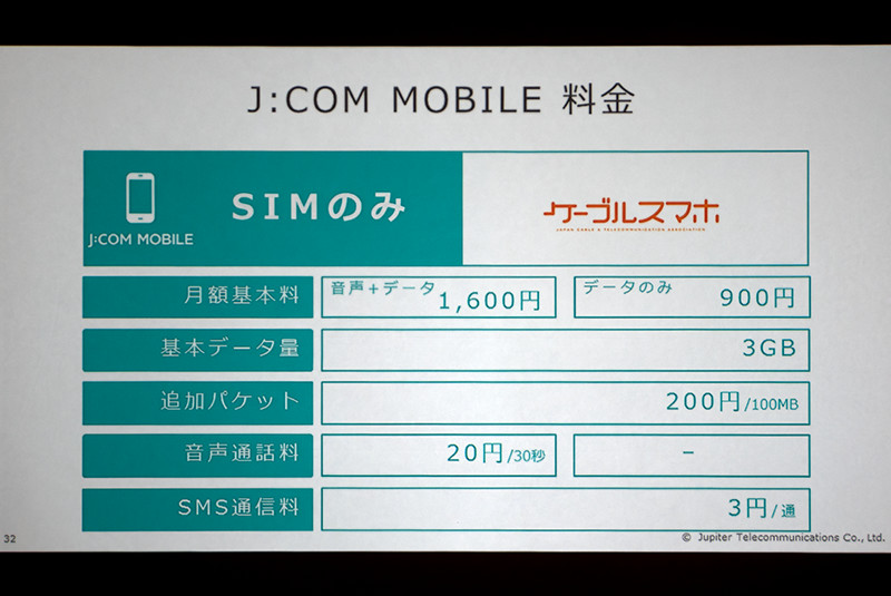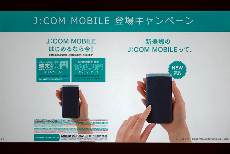 これに端末代金1,375円(24回払い)が加算され、総支払額が33,000円となる。ただし、ケーブルテレビ加入者(J:COM TV)もしくはインターネット接続サービス加入者(J:COM NET)であれば、2016年1月11日まで端末代金が実質0円となる施策も10月29日よりスタートする。なお、au回線のMVNOについてはL2接続だとのこと。