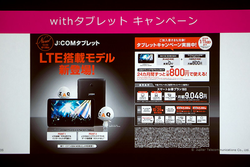 さらに上記2つのJ:COMサービスのほかに、固定電話サービス(J:COM PHONE)加入者であれば割引キャンペーンが適用され、端末代金実質0円、月額料金が800円となる。このキャンペーンも期間は同じく10月29日から2016年1月11日までとなる。
