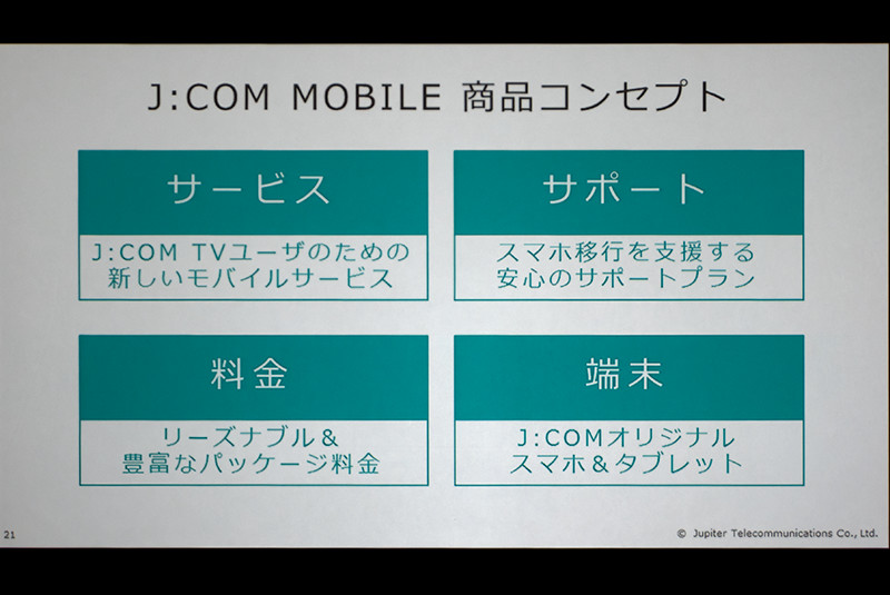 既報通り、ジュピターテレコム(以下、J:COM)は13日、都内にて「J:COM MOBILE 記者発表会」を開催し、移動体通信事業者(MNO)から回線を借り入れて提供している携帯電話サービス「J:COM MOBILE」( https://www.jcom.co.jp/service/mobile/