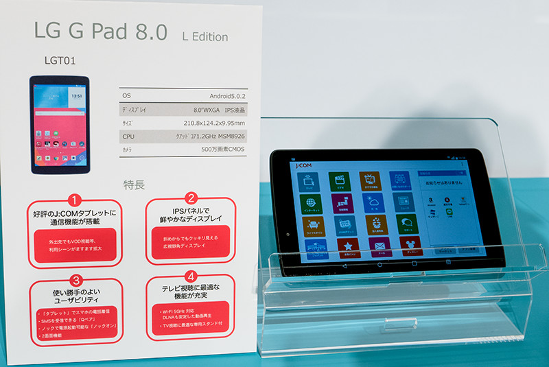 こちらは「J:COM TV」もしくは「J:COM NET」の加入者向けに「with タブレット」として提供される製品で、月額980円で1GBまでの高速データ通信が可能だ。端末価格は一括で26,400円、分割で月額1,100円×24回。LG Wine Smartと同様にJ:COMオンデマンドアプリによるデータ通信量は含まれず、無制限に視聴可能なほか、各種サポートなども受けられる。