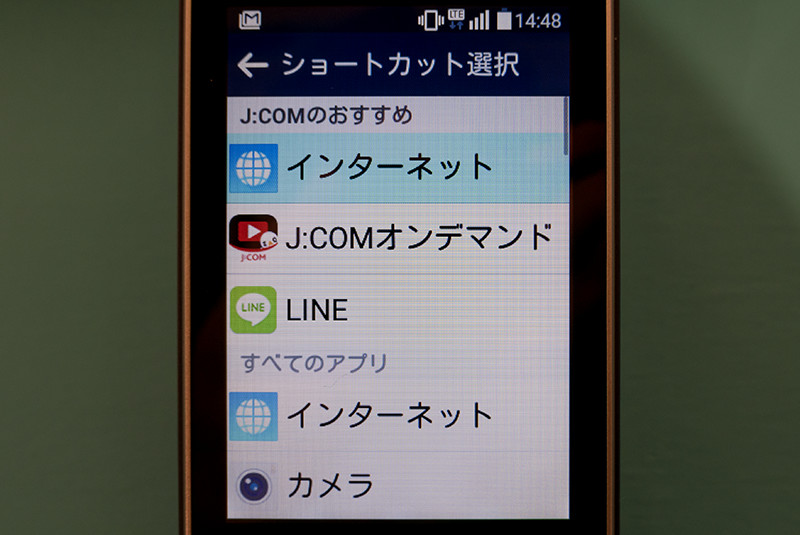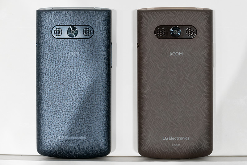 背面には「J:COM」と「LG Electronics」のロゴ、約300万画素アウトカメラがある。