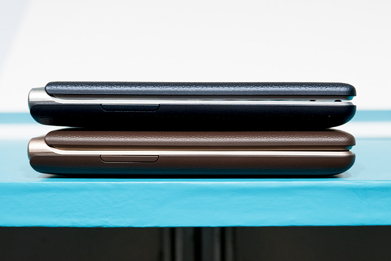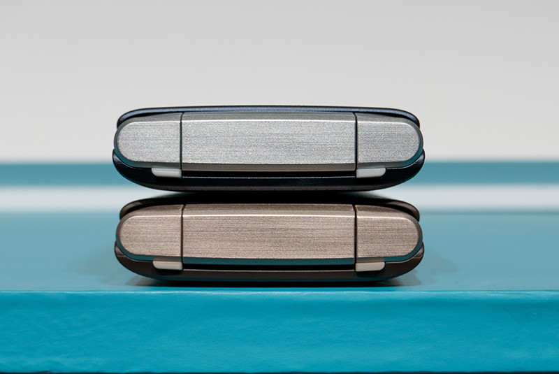 ボディーカラーはネイビー(写真=左)とブラウン(写真=右)で、カラーに合わせてシルバーとシャンパンゴールドのようなパーツで構成している。サイズは閉じた状態で約117.7×58.7×16.6mm、質量は約143g。開いたディスプレイ面には約30万画素インカメラを搭載。