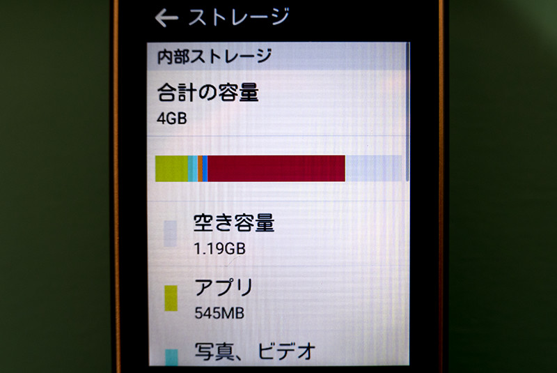 内蔵ストレージは4GBであるため、アプリのインストールやデータ領域としての空き容量が厳しい。
