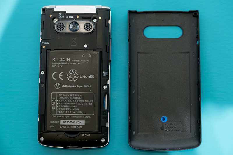 リアカバーを取り外したところ。本体、向かって右側面にmicroSDカードスロットが見える。バッテリーの取り外しは可能だが、バッテリー単体の販売の予定はないとのことだった。電池容量は1650mAhで、連続通話時間は約185分以上、連続待受時間は約830時間。SIMカードはバッテリーを取り外してから抜き差しする。なお、SIMロックがかかった状態で販売されるとのこと。
