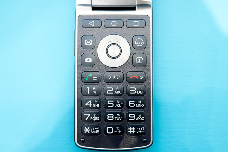 テンキーは大き目で、押した感触がしっかりとある。方向キーの上部にはAndroid標準の3つのナビゲーションキーが並ぶ。メール、カメラ、アドレス帳の専用キーが並ぶなか、J:COMのキャラクターが描かれた「ざっくぅキー」が目を惹く。ざっくぅキーはカスタマイズ可能で、WebブラウザーやLINEなどのアプリのショートカットキーとして利用できる。