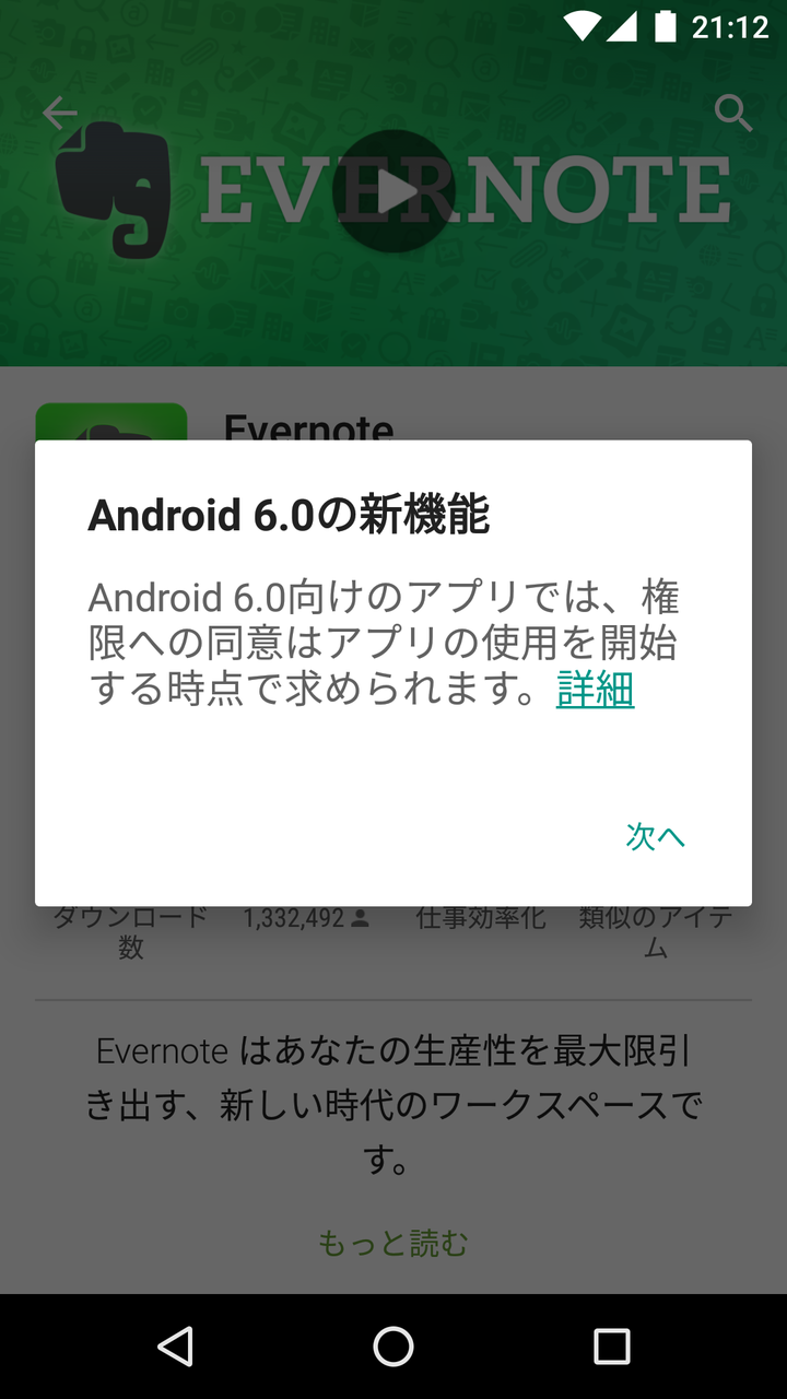 なおAndroid 6.0のアクセス権限機能に対応したアプリは、アプリインストール前にアクセス権限リストが表示されなくなります。アプリ実行中に権限を個別に指定するため、インストール前の確認は不要ということなのでしょう。