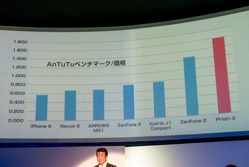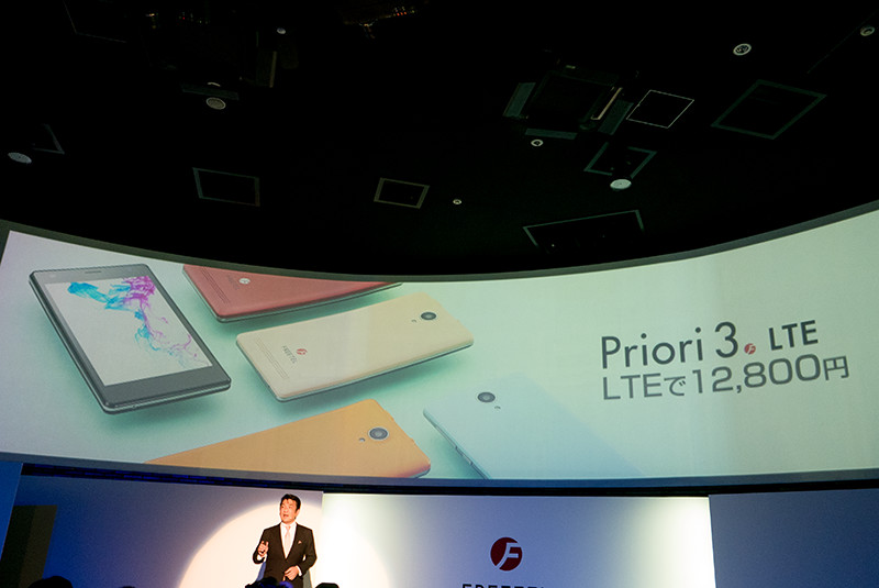 まずは、エントリーモデルとなるPriori3 LTEについて「LTEに対応して12,800円、圧倒的な低価格を実現することができました」と紹介した。前モデル「Priori2」は10万台を販売し、「FREETELブランドを知ってもらえるきっかけとなったのではないか」と語り、Priori3 LTEはカメラの画素数を800万画素に向上させ、無線LAN(Wi-Fi)をIEEE 802.11aに対応させ、世界最高クラスのコストパフォーマンスであることをアピールした。