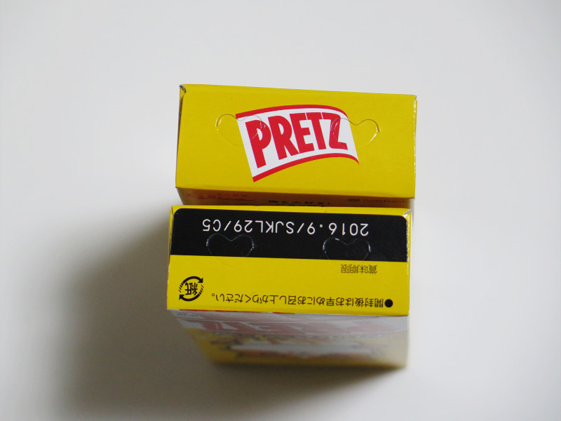 天面および底面、左右側面は店頭で売っている通常のプリッツとほぼ変わりません。ちょっと気になった点としては、Y!mobileでもらえるプリッツにはバーコードが記載されていないのに対して、SoftBankでもらえるプリッツにはバーコードが印刷されていました。