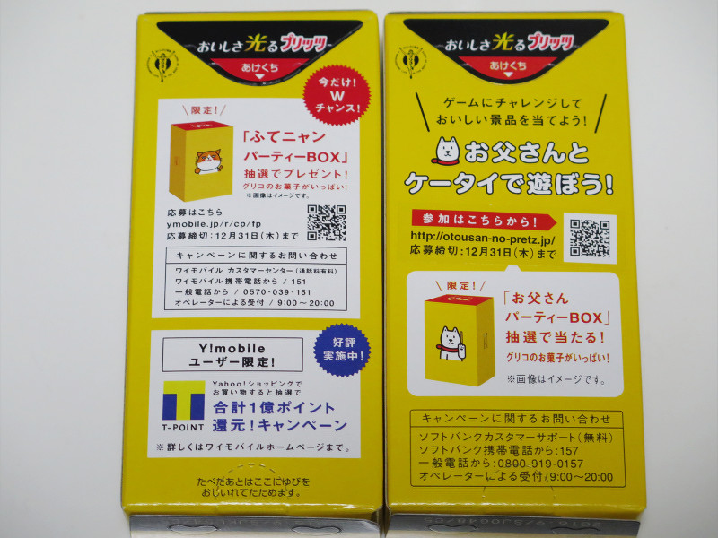 パッケージ正面に描かれているイラストが違うのがひと目でわかります。SoftBankでもらえるのは白戸次郎(お父さん)、Y!mobileでもらえるのは最近のY!mobileのテレビCMでもおなじみのふてにゃんがそれぞれプリッツを持っている姿として描かれています。どちらのプリッツも「おいしさ光るプリッツ」という製品名のようです。