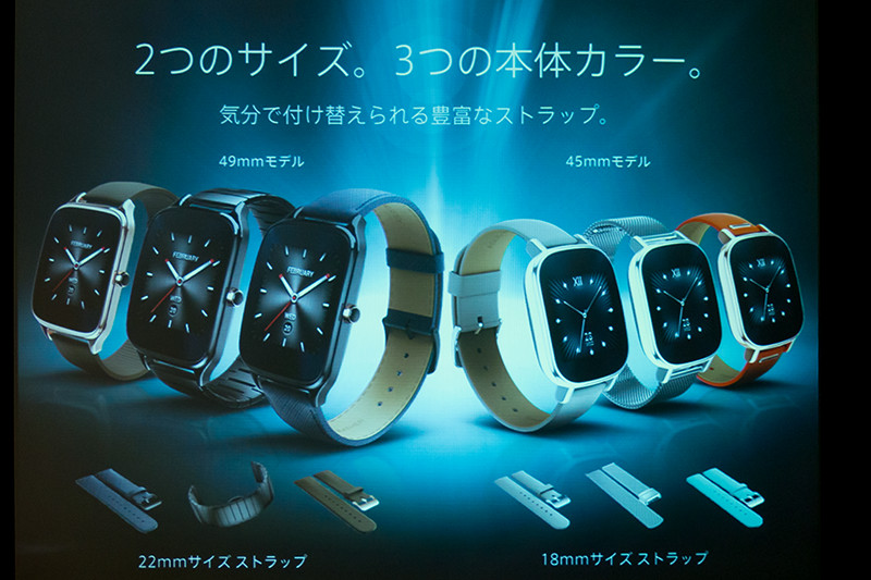 ZenWatch 2は49mmモデルと45mmモデルの2つのサイズ、3つの本体カラー展開であることを発表。ストラップは本革、ゴム製のスポーツストラップ、メタルタイプの3つを用意し、合計で8種類。「初代ZenWatchはひとつのサイズでカラーも1種類だったので、女性や腕が細い人はしづらかったのではないか。今回はファッション性のみならず、カスタマイズ性もアップしているので女性でもつけやすいバリエーションとなっている」と紹介した。