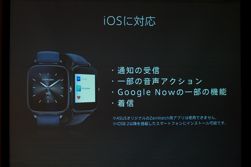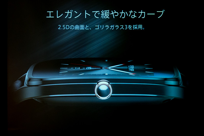 続けて、出浦氏は「ZenWatchから引き継いだ2.5Dの曲面ガラスはゴツさを和らげ手にフィットするデザインとしている」と説明した。また、Corning製「Gorilla Glass 3」を採用し、傷を気にせず使える点をアピールし、前機種では背面にあった電源ボタン・ウェイクアップボタンを側面に移動し使い勝手を向上している。