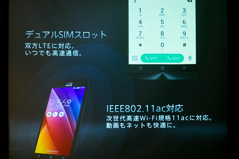 SIMカードスロットはLTE対応のデュアルSIMスロットとなり、いつでも高速通信ができることを紹介。ただし、SIM1およびSIM2のスロットは切り替え式で、同時使用はできないことを補足説明した。Wi-Fi規格のIEEE802.11acに対応しているので、5インチモデルよりもさらに快適に使える点を紹介した。