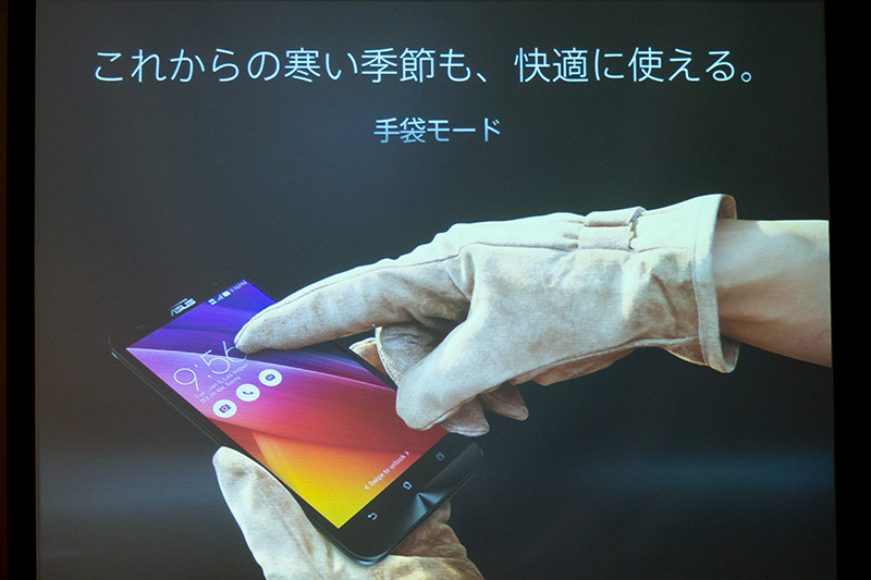 これからの季節に最適な手袋モードを搭載。「手袋の先端が静電気を発生するスマートフォン用手袋ではない普通の手袋でもいつも通りスマートフォンを操作できる」と紹介した。