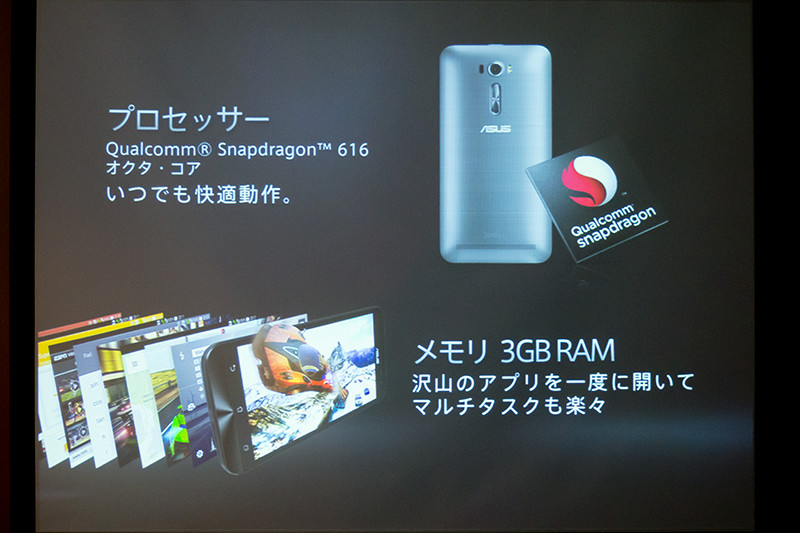 5インチモデルはクアッドコア(Qualcomm製「Snapdragon 410」)だったのに対して、6インチモデルはオクタコア(Qualcomm製「Snapdragon 616」)となり、内蔵メモリー(RAM)も3GBとなったことでマルチタスクも快適に動作することを強調した。