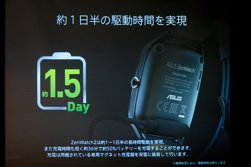 バッテリーは約1日半の駆動時間を実現し、「従来のZenWatchでは電池の減りが早いときは夕方に充電することもあったが、ZenWatch 2は1日使って次の日の朝に数十%残っている」と紹介。さらに急速充電に対応し約36分間で50%の充電が可能となっているとアピールした。