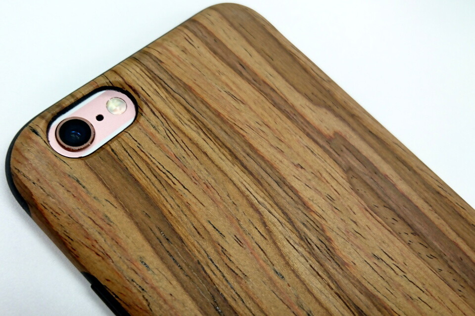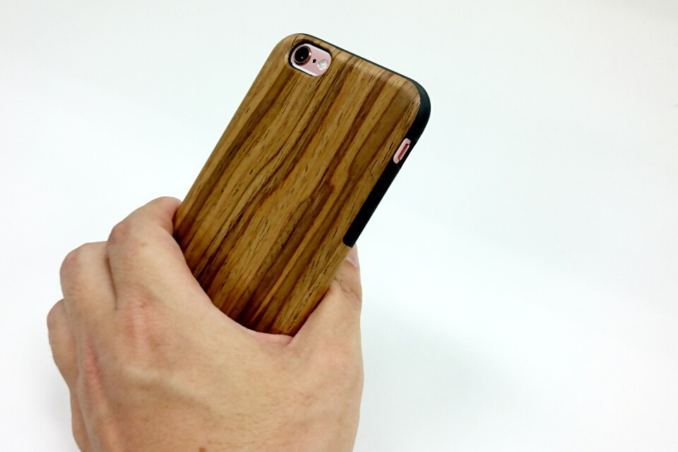 ケース背面のカメラとフラッシュ部分もちゃんと開口しているので、ケースを装着したまま、写真撮影をすることが可能です。手に持つと、木目調のデザインがかなり際立つ一方で、正面から見るとiPhoneの周囲をぐるりと黒いラインが覆うだけです。操作している際は、普通の黒いケースを着けている印象で、裏を向けるとリアルな木目というギャップが楽しめます。