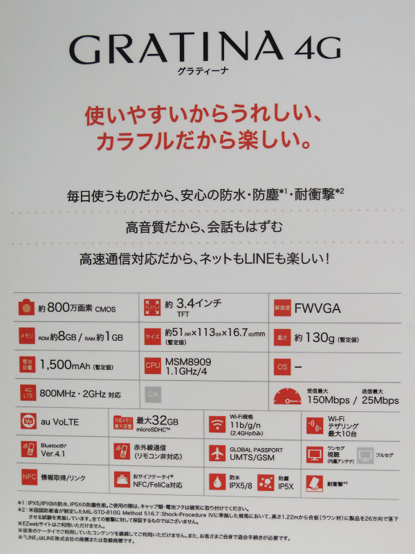 GRATINA 4Gはau向けガラホとしては昨年発売された「AQUOS K SHF31」および「AQUOS K SHF32」(ともにシャープ製)に続く3機種目で、au向けでは初の京セラ製のAndroidケータイです。AQUOS K SHF32に続いて、4G LTEケータイでVoLTEによる高音質通話サービスはもちろん、防水(IPX5およびIPX8準拠)および防塵(IP5X準拠)、耐衝撃(アメリカ米軍が定める耐久試験「MIL-STD-810G」に準拠した耐衝撃性能)性能を有しています。