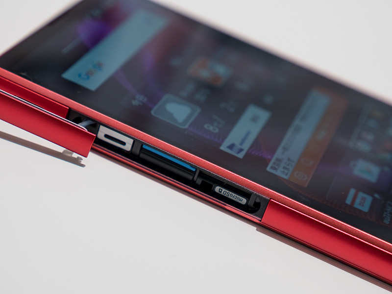 SIMカードおよびmicroSDカードスロットの防水キャップを外したところ。