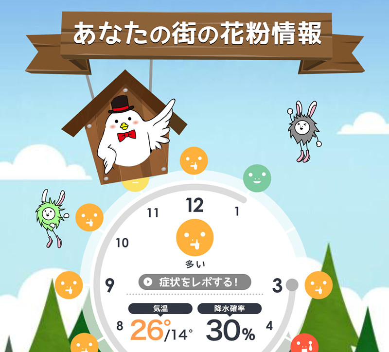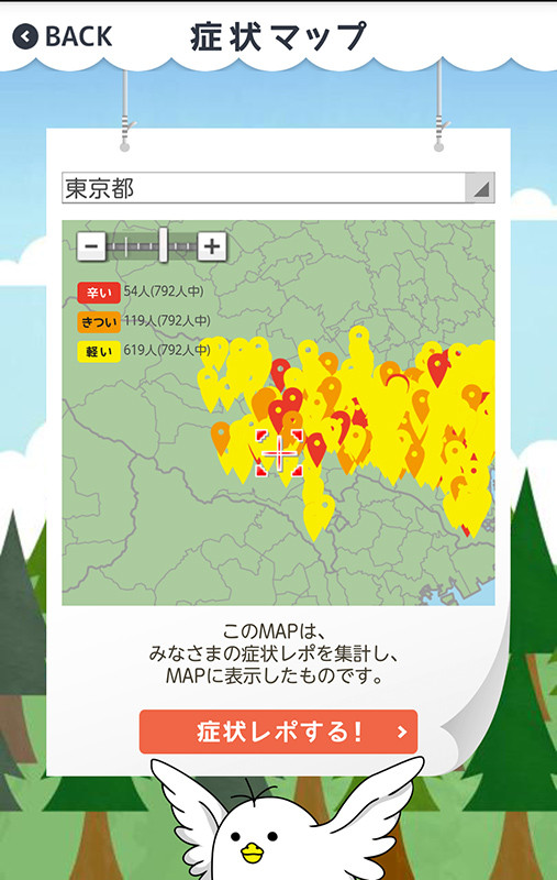 この症状レポは花粉症の症状を「なし」や「軽い」、「きつい」、「辛い」の4段階で登録します。するとそれぞれの色が地図に表示されるという仕組み。登録後は症状レポの地図を確認や、花粉症対策をチェックできます。