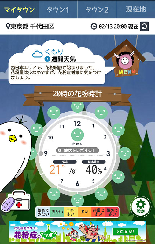 地域設定として自宅などの「マイタウン」と勤務先や出張先などを登録できる「タウン1」および「タウン2」の3つと、「現在地」で花粉情報をチェックできます。