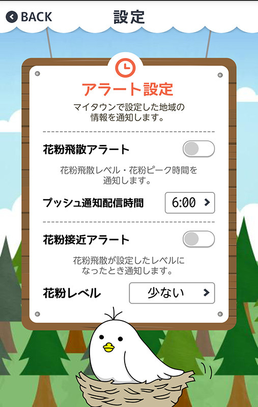 花粉飛散のピーク情報をまとめて受けられる「花粉飛散アラート」とあらかじめ設定しておいた花粉飛散量で通知をしてくれる「花粉接近アラート」の2つが設定できます。