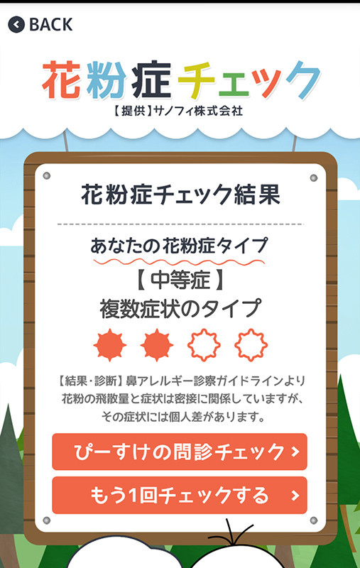 さらに、設問に答えることで花粉症タイプを診断する「花粉症チェック」機能もあります。この機能は設定アイコンをタップして「花粉症チェック」で呼び出すことができます。