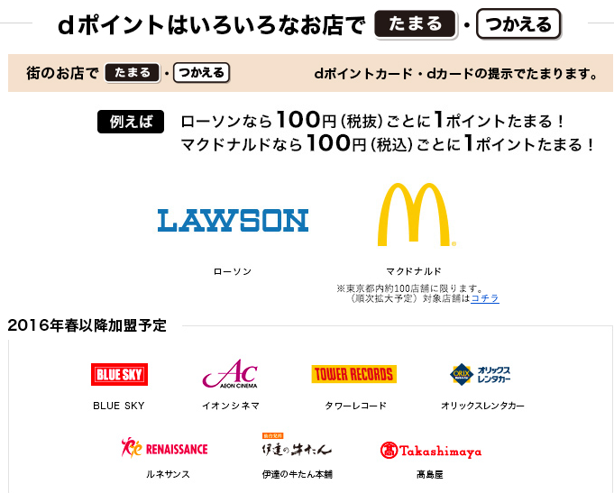 dポイント加盟店は、現時点ではローソンおよび一部のマクドナルドのみで、今春以降にイオンシネマやタワーレコード、オリックスレンタカー、タカシマヤ、伊達の牛たん本舗、ルネサンス、BLUE SKYが加盟予定となっている。