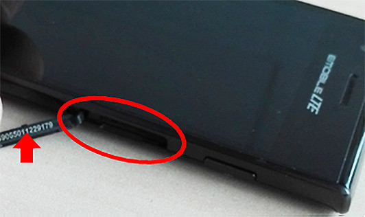 ・USIMトレーカバー(赤枠)内のシール(赤矢印)で確認する。