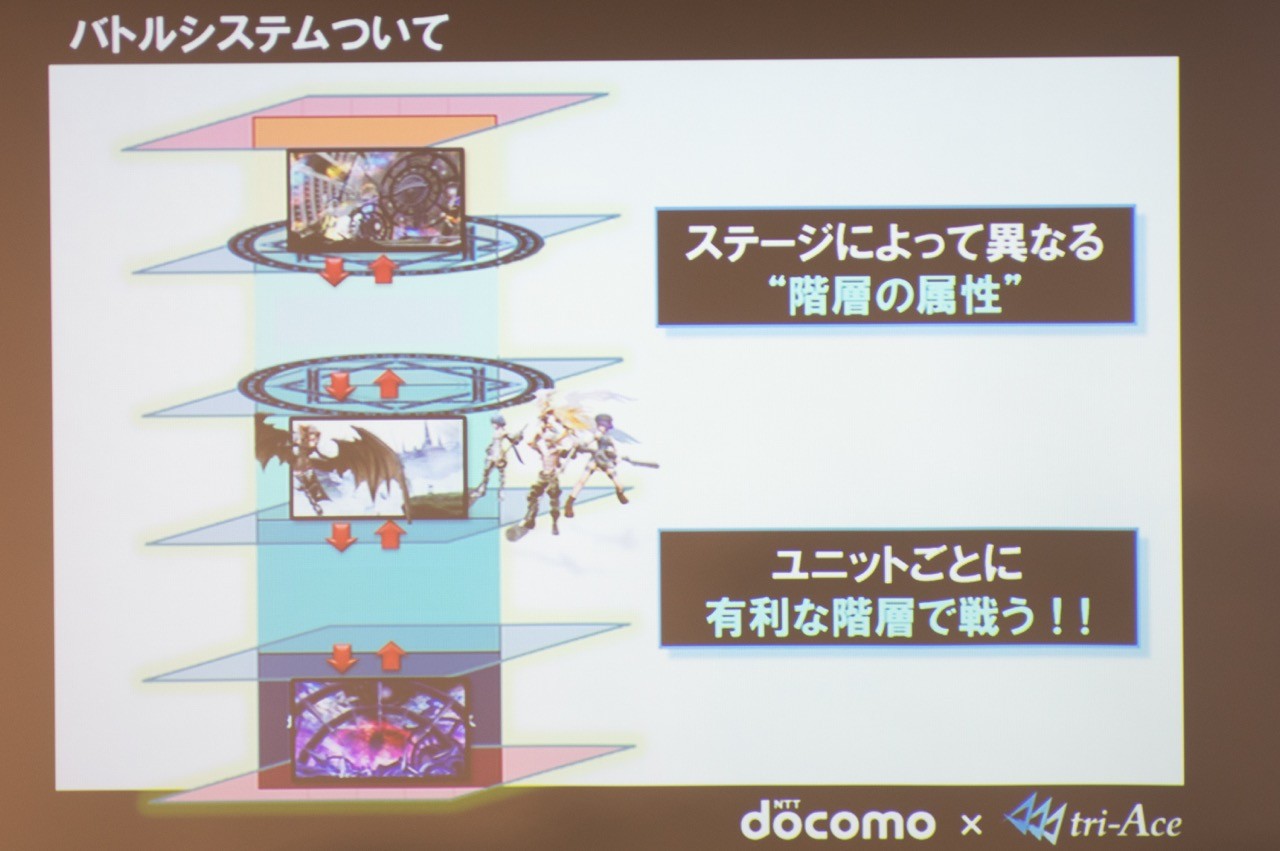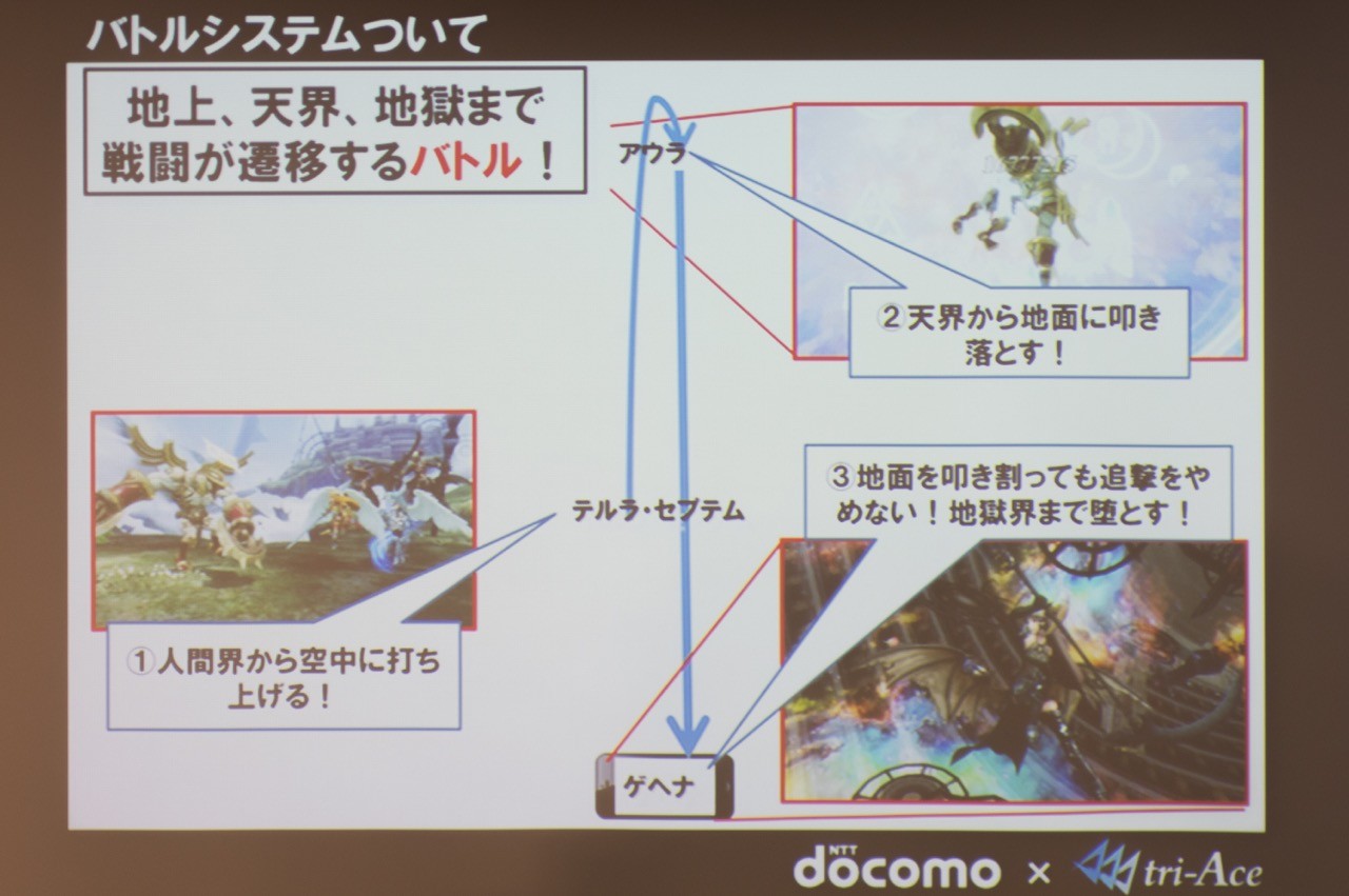 続いて、NTTドコモのコンシューマビジネス推進部 野尻真太氏と、トライエース 開発管理部プロデューサーの向峠慎吾氏からはゲーム内容の詳細が語られた。