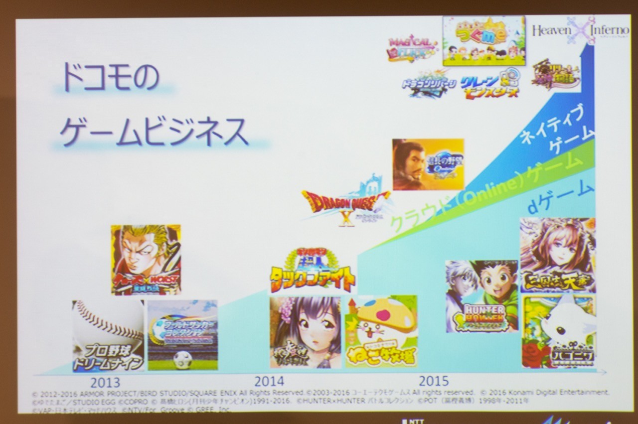 まずはじめにNTTドコモ コンシューマビジネス推進部長 前田義晃氏が登壇。同社が展開するゲーム向けポータルサービス「dゲーム」ではクラウドゲームやネイティブアプリゲームのタイトルを増やしつつある流れを紹介した。