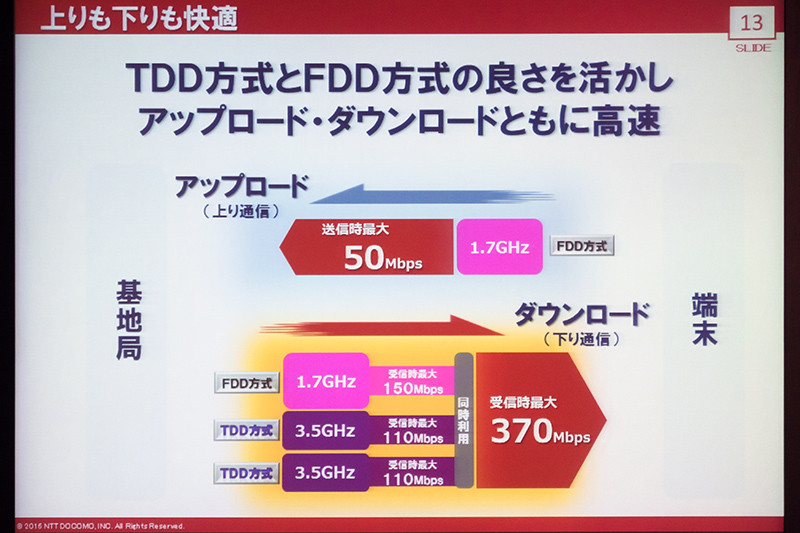 3.5GHz帯を追加したCAでは、FDD方式による1.7GHzの受信時最大150MbpsとTDD方式による3.5GHzの受信時最大110Mbpsが2つの合計3波によって、受信時最大370Mbpsを実現。なお、上り通信は1.7GHzの最大送信50Mbpsとなる。