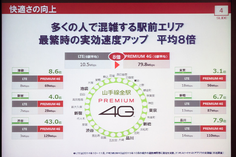 説明会には同社 常務の大松澤清博氏が登壇し、冒頭で多くの人で混雑する駅前エリアのPREMIUM 4G化ですでに最繁時の実行速度が平均8倍にアップし、快適さが向上していることを紹介した。