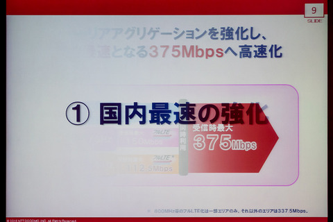 続けて、今後の進化として国内最速の強化をするために、2GHz(Band 1)の受信時最大112.5Mbpsと1.7GHz(Band 3)の受信時最大150Mbps、フルLTE化した800MHz(Band 19)の受信時最大112.5Mbpsを同時利用する3CC CAで受信時最大375Mbpsへ高速化すると発表した。