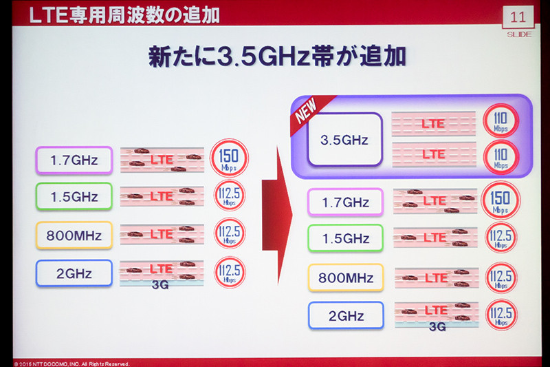 ただし、800MHzは依然として3G(W-CDMA方式、FOMA)でも使われているため、フルLTE化は新宿などの一部エリアのみでそれ以外のエリアは受信時最大337.Mbpsとなる。なお、800MHzをフルLTE化したエリアでも3Gがきちんと使えるように配慮していく。