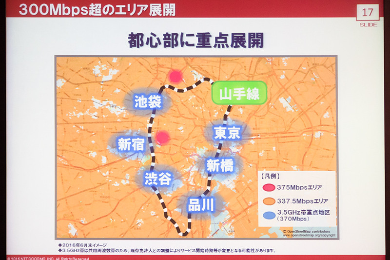 また、300Mbps超のエリアは、通信トラフィックの緩和を目的として都市部を中心に展開する。さらに高速な375Mbpsのエリアについては、東京では新宿と池袋の一部にエリアを設ける。また、3.5GHz帯重点地区として東京および新橋、品川、渋谷、新宿、池袋の山手線エリアが挙げられた。