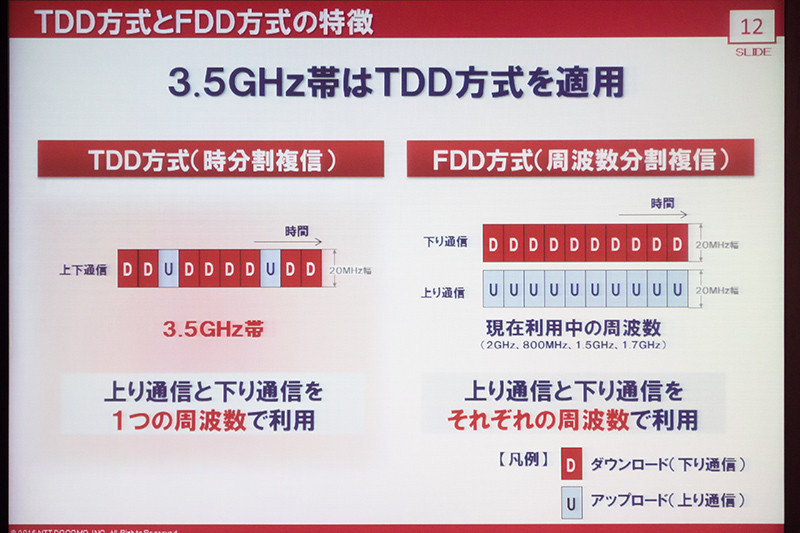 この3.5GHz帯はTDD方式を適用し、上り通信(送信時)と下り通信(受信時)を帯域で分割したFDD方式とTDD方式の良さを活かした上り・下りの高速通信を実現していく。