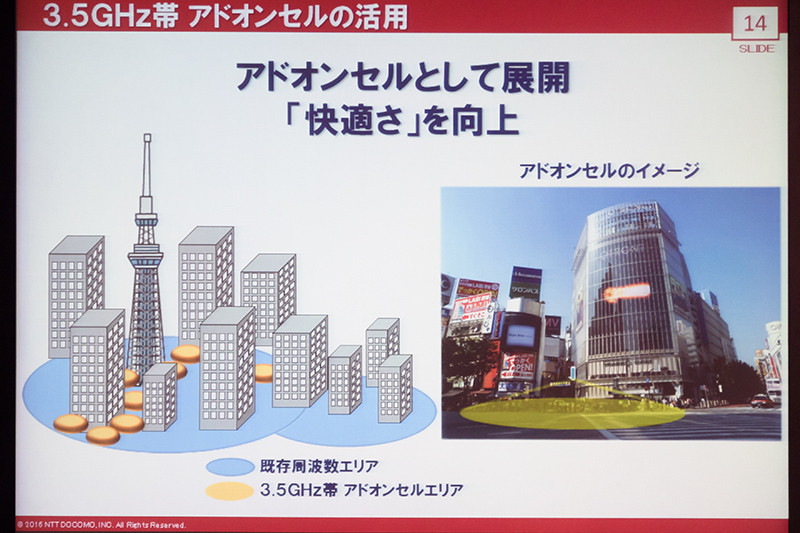 3.5GHz帯はアドオンセル(既存のネットワークに追加する形)として展開し、特に混雑するエリアにおいて「快適さ」を向上することが目的としている。同社では2016年2月24日に実施したフィールド試験では実行速度340Mbpsを計測したとして通信の有用性をアピールした。