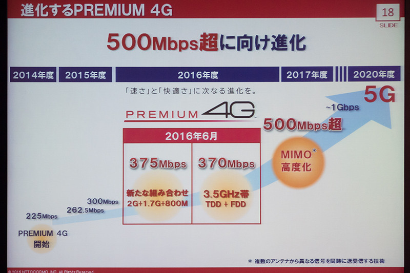 今後は500Mbps超を2017年度に実現、さらに1Gbpsをめざし、2020年の5Gを実現していく。これらはマルチアンテナ(MIMO)やCAの束ねる波を増やした4CCや5CC、変調方式を256QAMに高度化するなどが導入される予定だ。