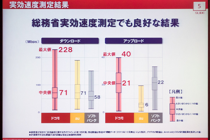また、総務省の主導によって行われている実行速度測定においてもすでに判明しているように、NTTドコモがauやソフトバンクよりも良好な結果になったことを報告した。