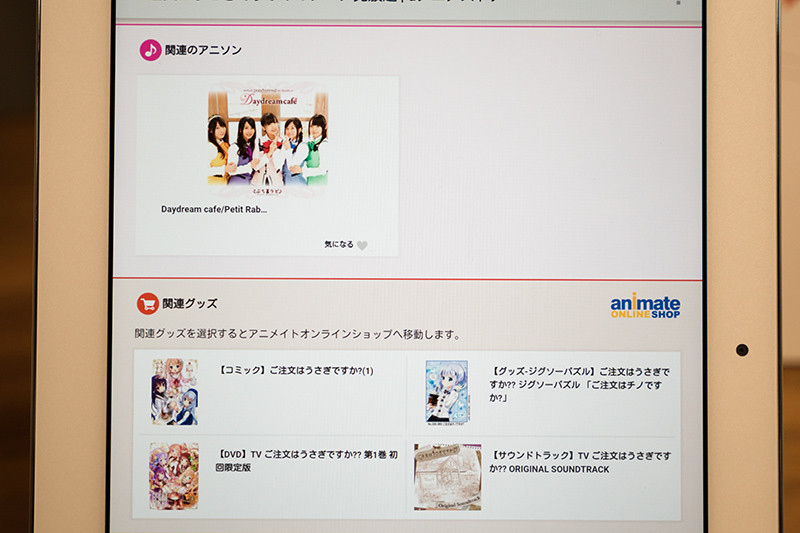 もうひとつの機能が「アニメイトのショッピング連携」の実施だ。この機能も同じく作品ページに関連グッズがアニメイトの人気順に表示される。各グッズを選択すると、「アニメイトオンラインショップ」で購入が可能となる(別途、アニメイトの会員登録が必要)。