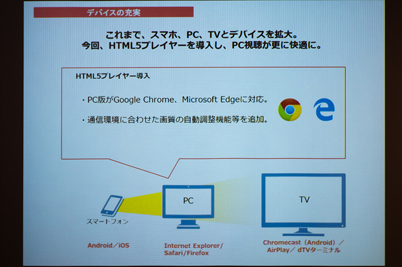 また、PCでより快適に視聴できるようHTML5プレイヤーの提供も開始する。対応Webブラウザーに「Google Chrome」と「Microsoft Edge」が加わる。HTML5プレイヤーでは、通信環境にあわせて画質を自動調整するなどの機能が追加されるとのことだ。