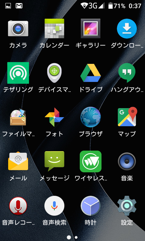 また、テザリングがアプリアイコンとして表示されていますが、これはソフトバンクのAndroid搭載機種のようなテザリングアプリではなく、Android標準のテザリング設定のショートカットとなっています。