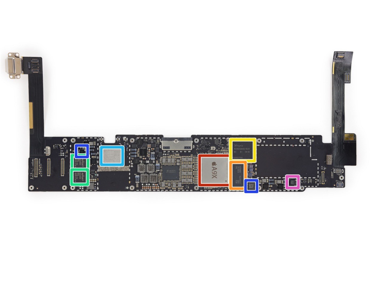チップセットは同じ「Apple A9X」で、iPad Pro 12.9と同じ「APL1021」。コプロセッサー「Apple M9」も搭載。一方、内蔵ストレージはSK Hynix製32GB NAND Flash「H23QEG8VG1ACA」。iPad Pro 12.9ではTOSHIBA製でしたが、各製品ごとに部品が統一されているかは不明。